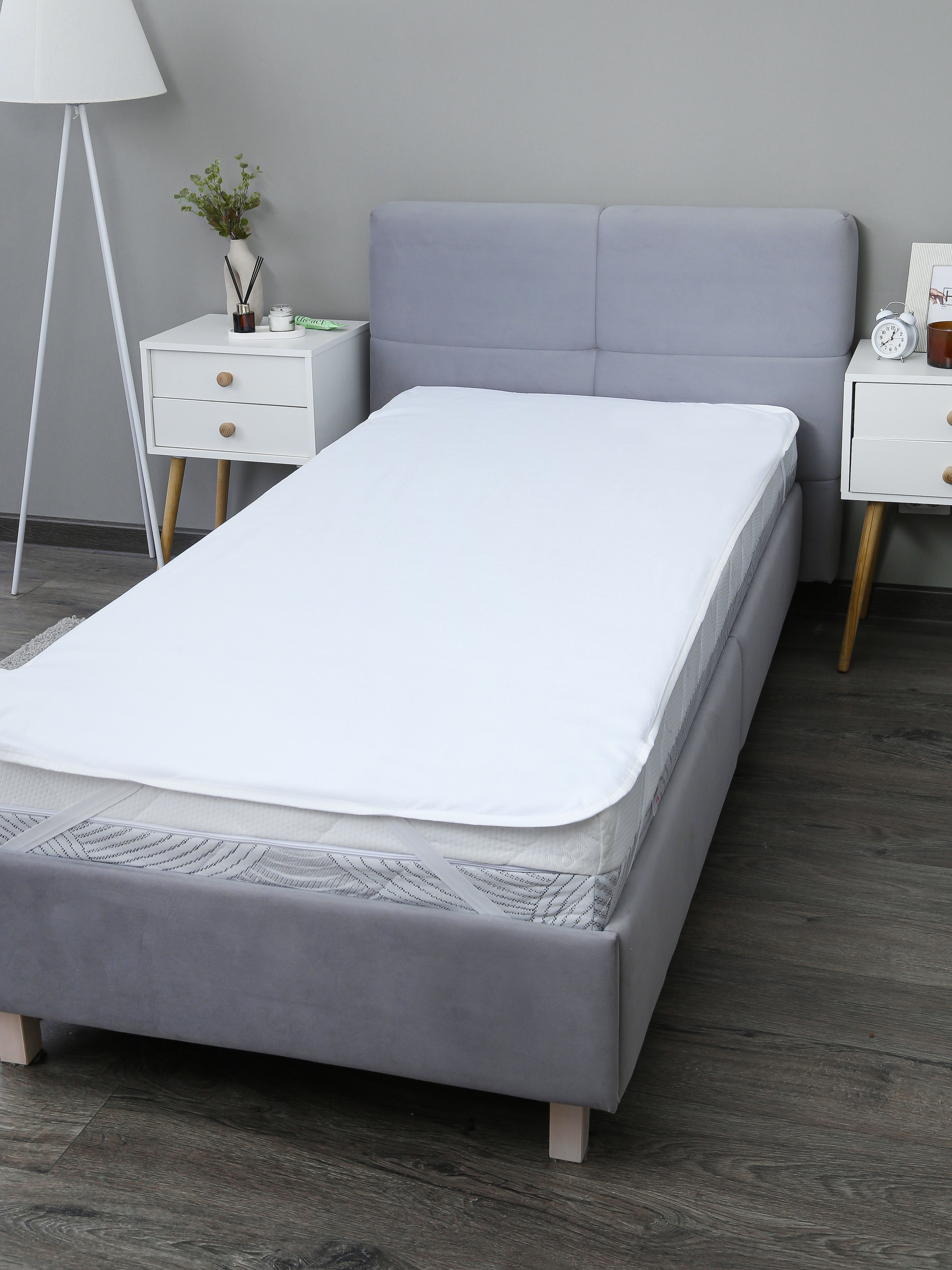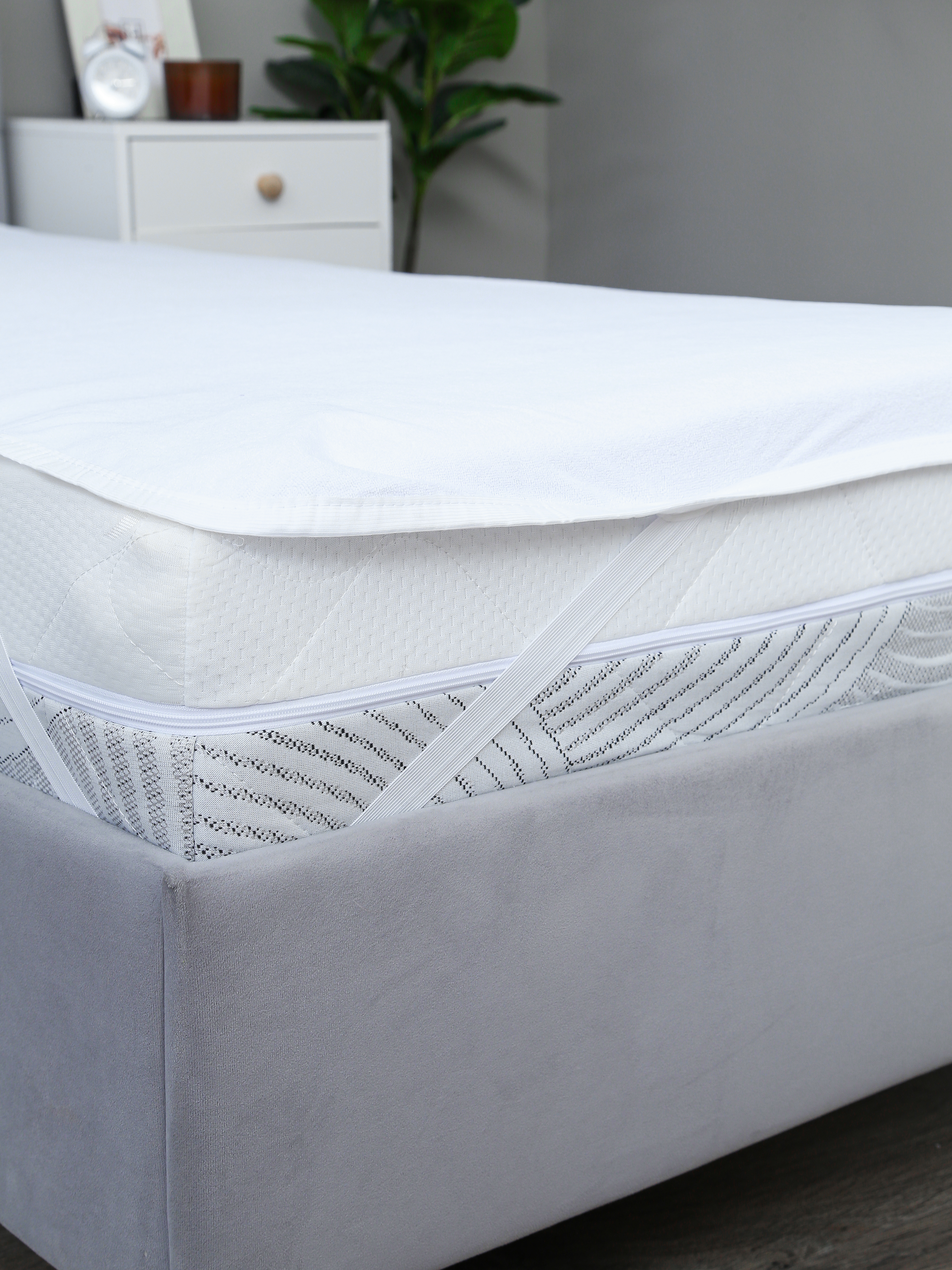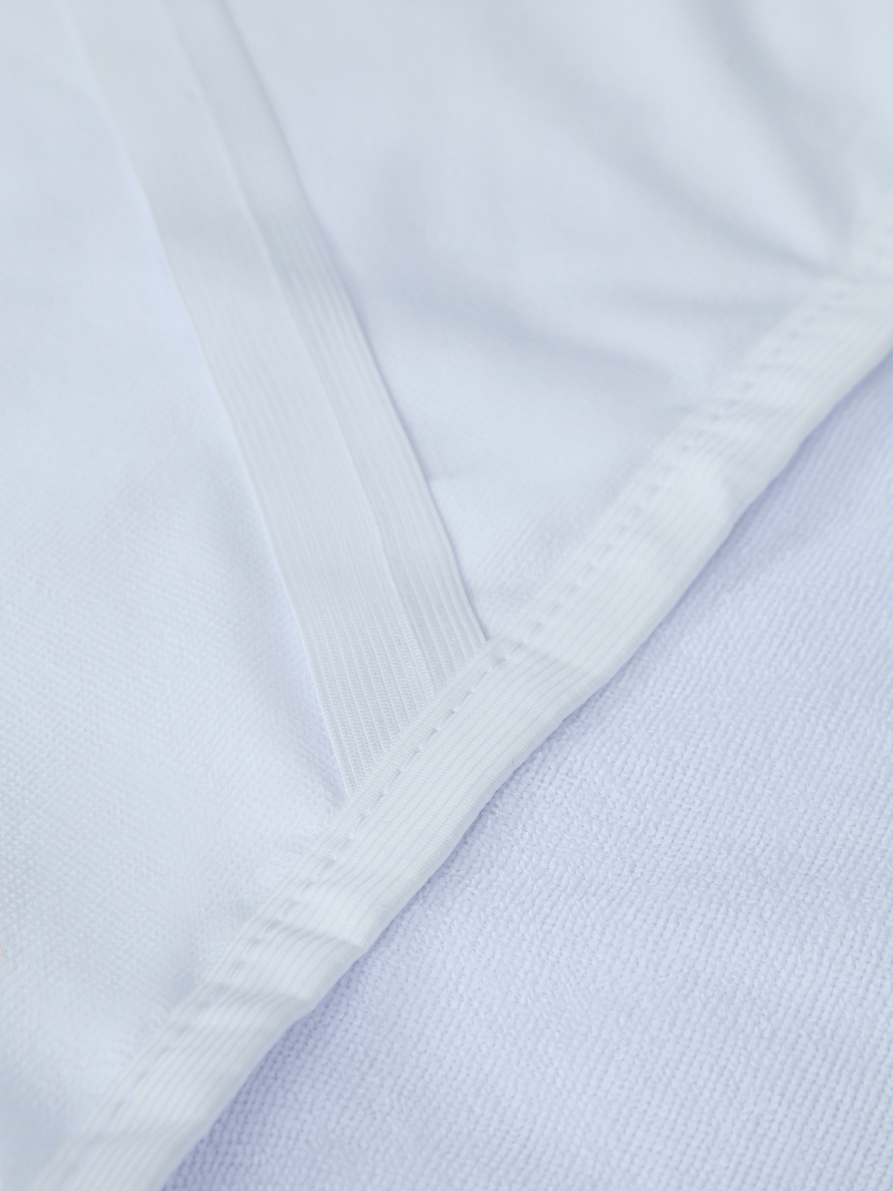 Эластичный борт из трикотажной сетки обеспечивает плотную посадку на матрасе и защищает его боковые поверхности. Благодаря высокой эластичности сетка подходит для матрасов разной высоты и не деформируется со временем. Фиксация осуществляется с помощью прочных бельевых резинок по углам — они надёжнее стандартных вязаных резинок и сохраняют упругость даже после многократных стирок.